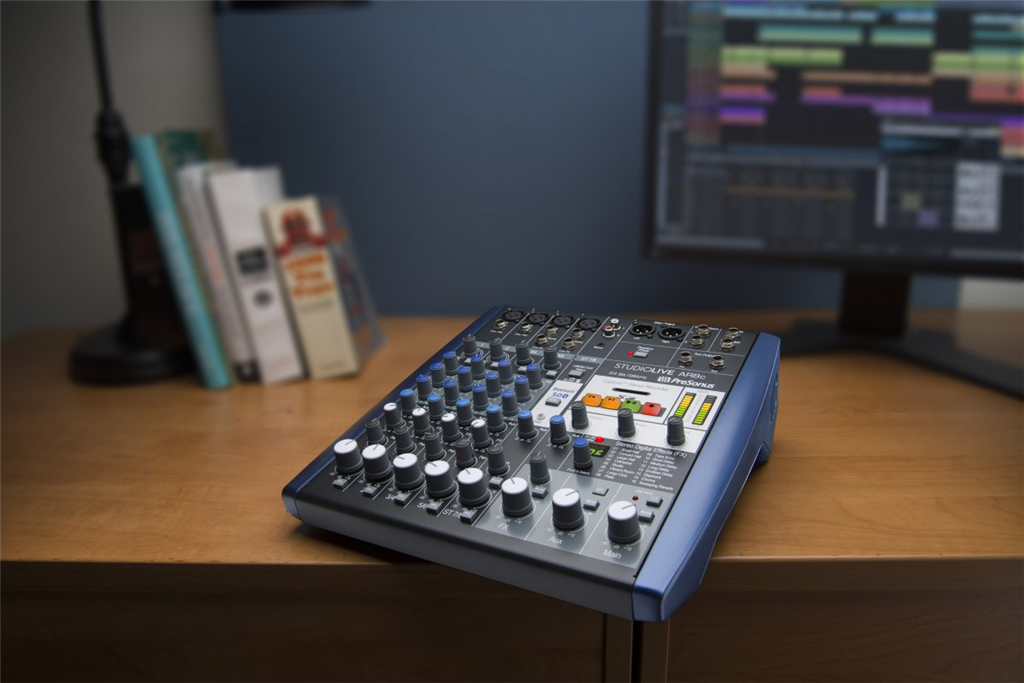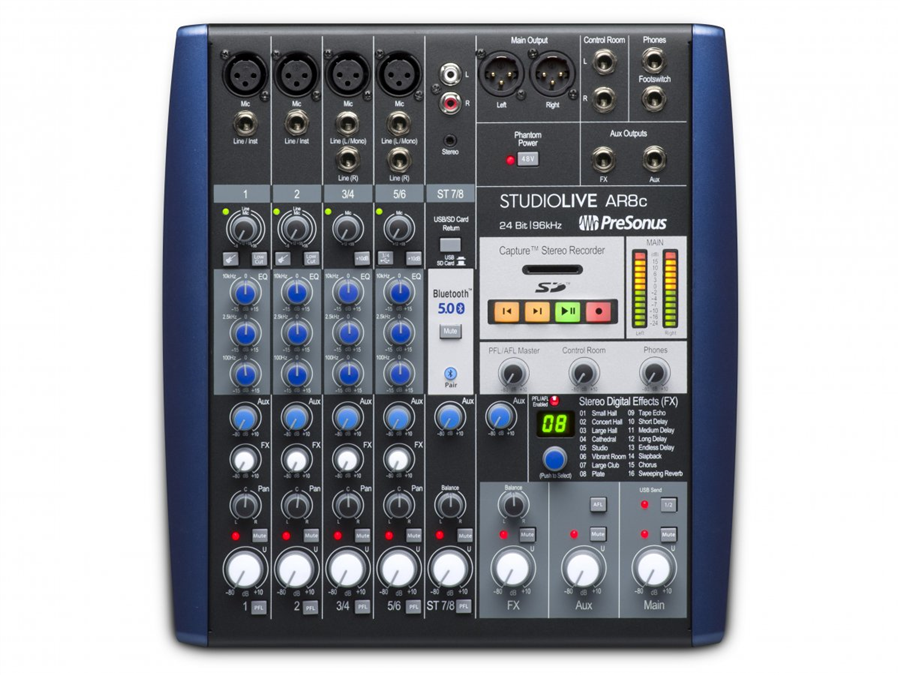 Kompaktní analogový mixážní pult, SD rekordér, připojení k PC pomocí USB-C, Bluetooth přijímač, FX