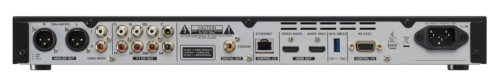 Bytelné kovové šasi má standardní rozměry 1U. Čelní panel nabízí sloty pro disk a SD kartu, přehledný displej a základní ovládání, další funkce jsou dostupné prostřednictvím přiloženého dálkového ovladače. Konektivita je přehledně seskupena na zadní straně přístroje. Osazeny jsou audio výstupy pro stereo (XLR a RCA) i 7.1 konfiguraci (RCA), dále je k dispozici koaxiální digital out, dvojice HDMI výstupů (2.0 audio/video, 1.4 pouze audio), ethernet konektor, RS-232C připojení a slot pro USB disk 3.0. Přístroj dokáže přehrát videa ve formátech 3gp, asf, avi, dat, m2ts, mkv, wmv, mov, mp4, mpg, ogm, tp a ts, zobrazit obrázky ve formátech jpg, gif a png a přehrát audio ve formátech aac, ape, flac, mp3, wav, a wma.