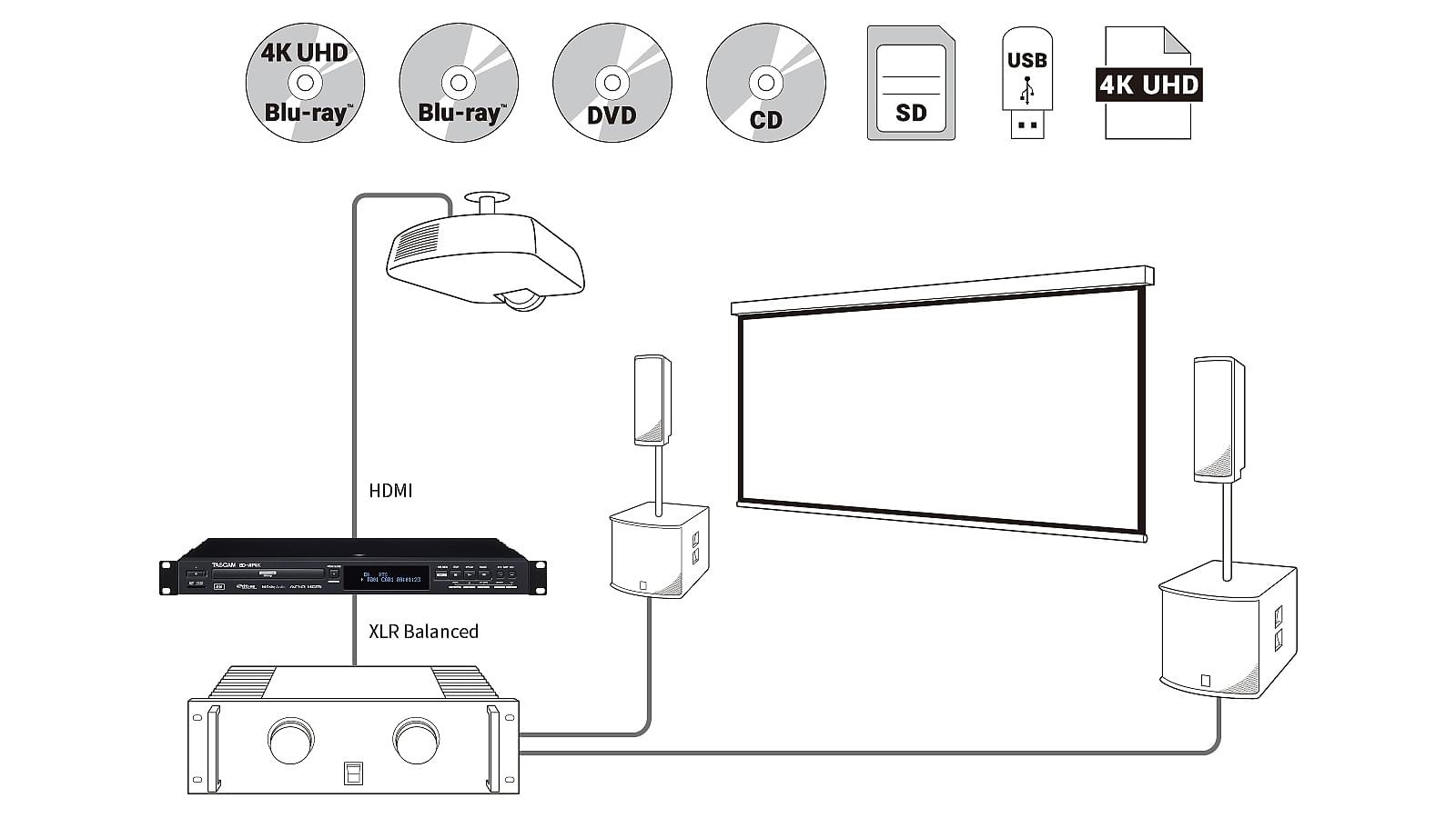 BD-MP4K je profesionální 4K multimediální přehrávač značky Tascam. V kompaktním provedení o velikosti jedné rackové jednotky nabízí all-in-one řešení pro přehrávání videa, zvuku a obrazových materiálů v mnoha oblíbených a často požadovaných formátech. Jde tedy o ideální zařízení pro vzdělávací centra, kongresové sály, kulturní podniky, ale i divadla nebo restaurace. Kromě přehrávání z fyzických disků, SD karet a USB flash disků zvládne BD-MP4K zpracovat i síťová data. Díky ethernetovému připojení lze přehrávač snadno implementovat do složitějších systémů.