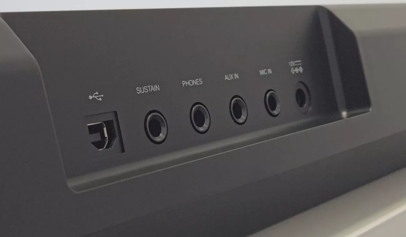 Na zadním panelu nástroje je umístěn konektor pro připojení napájecího zdroje (součástí balení), výstup pro sluchátka pro tiché cvičení, vstup pro sustain pedál (prodlužující dozvuk zahraných tónů), port USB to Host pro připojení k počítači, mikrofonní vstup a konektor AUX IN pro připojení externího audio přehrávače.