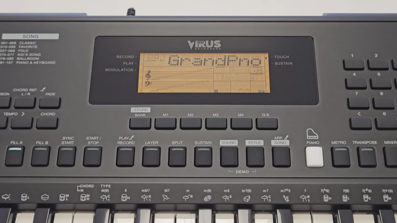 Keyboard Virus VRS 200 nabízí klaviaturu o rozsahu 5 oktáv, tedy 61 kláves s dynamikou úhozu. Jak silně libovolnou klávesu stisknete, tak silný tón se z nástroje ozve. To znamená, že ať už hrajete vášnivě nebo s zlehka a s citem, vaše hra bude vždy naprosto jedinečná! Úroveň citlivosti klaviatury lze také nastavit nebo zcela vypnout. Polyfonie, tedy počet tónů, které mohou znít současně, je 64hlasá.