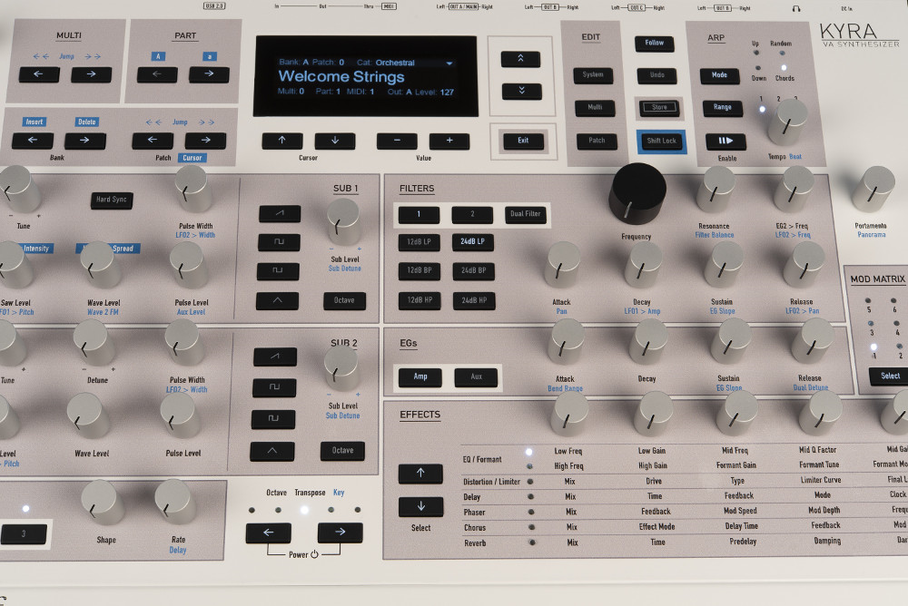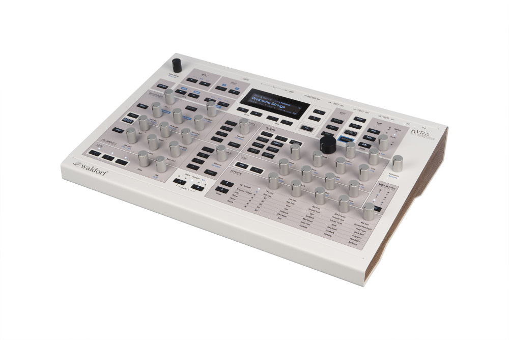 Objevte syntézu budoucnosti! Waldorf Kyra je unikátní virtuálně analogový syntezátor, světově první FPGA (hradlově programovatelný) synth podobného typu. Disponuje širokou škálou zvukových možností se 128 hlasy s 10 oscilátory na hlas. Kyra nabízí osm linkových výstupů, MIDI a USB. Může fungovat jako zvuková karta 8x Out.