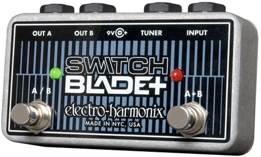 EHX Switchblade Plus nabízí možnost přepínání mezi výstupy A/B nebo jejich simultánní použítí A+B. Kytaru tak můžete mít zapojenou ve dvou aparátech a rychle je střídat nebo používat oba současně. Přepínač také disponuje vstupem pro ladičku.