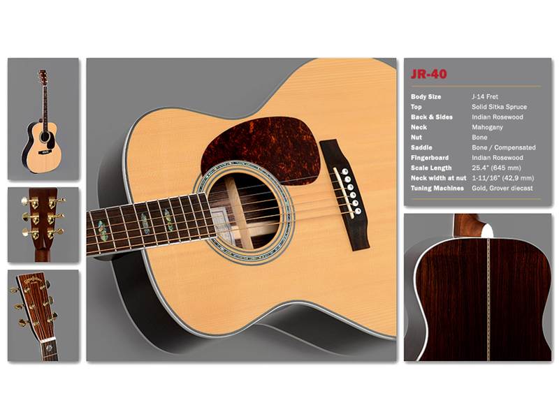 Styl modelu JR-40 se vyznačuje lemováním hlavy a hmatníku rozetou z abalonové perleti a velkými šestiúhelníky jako značkami v hmatníku, také z perleti. Zdobení je velmi působivé a v kombinaci s kvalitní, zlatou mechanikou Grover, vypadá nástroj velmi luxusně.